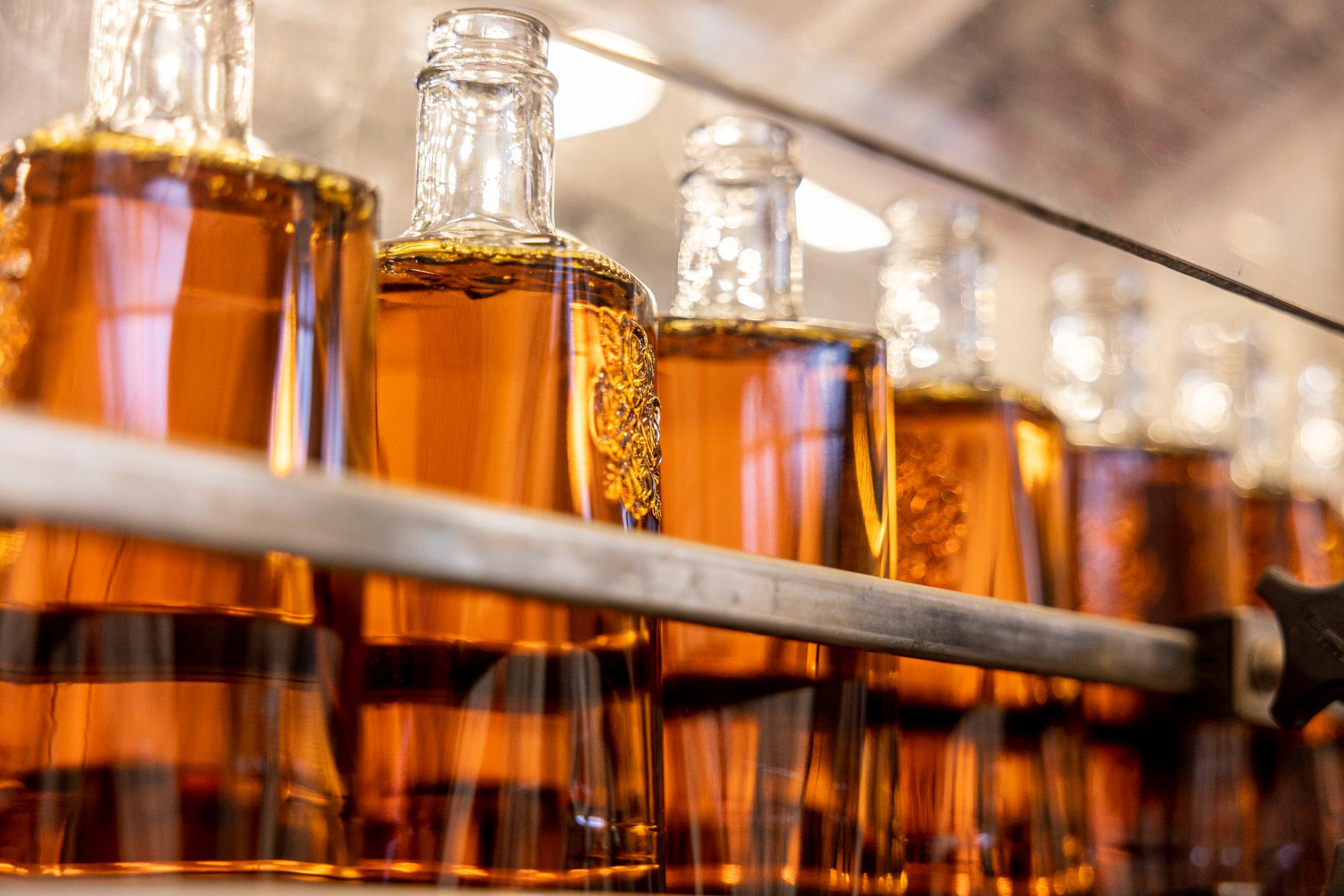 For our single-barrel bourbons, the hand-selected individual barrels are removed from the warehouse and sent into a stainless-steel trough to be proofed, tested, chill-filtered, and then sent straight to the bottling line.